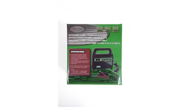 Acculader 6/12 volt Voeding 220 Volt. Keuze voor het laden van 6 of 12 volt accu's 6 Ampère. Volledig automatisch. Geen risico op overaden Beschermt tegen oververhitting CE keurmerk. Ideaal voor Start en Semi tractie accu's.