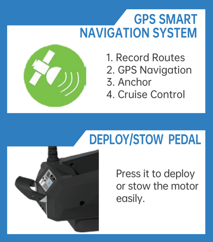 De boegmotor werkt met de handige Helmsman-app, beschikbaar voor zowel iOS als Android. Via de app kun je snelheid aanpassen, sturen en zelfs waypoints instellen om automatische routes vast te leggen. Met de handige geheugenfunctie kun je favoriete routes opslaan voor toekomstige trips. De geïntegreerde accustatusindicator op de motor en in de app zorgt ervoor dat je altijd op de hoogte bent van het batterijniveau, waardoor je onbezorgd kunt genieten van langere visdagen.